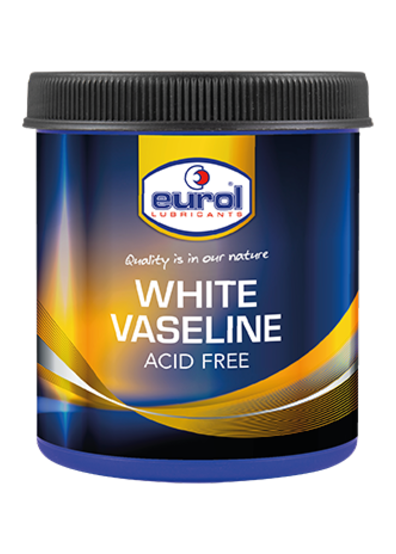 Eurol White Vaseline is geraffineerde petroleumgel van farmaceutische kwaliteit met een hoge zuiverheidsgraad. Het kan gebruikt worden als smeermiddel voor verpakkingsmachines en applicaties in de voedingsindustrie, alsmede in de cosmetische en farmaceuti